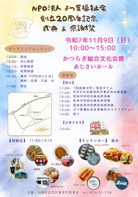 ▼以下より、よつ葉福祉会 創立20周年記念式典&感謝祭チラシをPDFにて閲覧いただけます